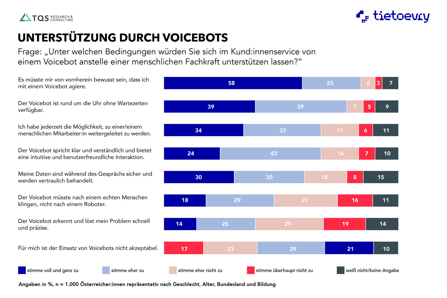 Infografik „Unter welchen Bedingungen würden Sie sich im Kund:innenservice von einem Voicebot anstelle einer menschlichen Fachkraft unterstützen lassen?“ © Tietoevry